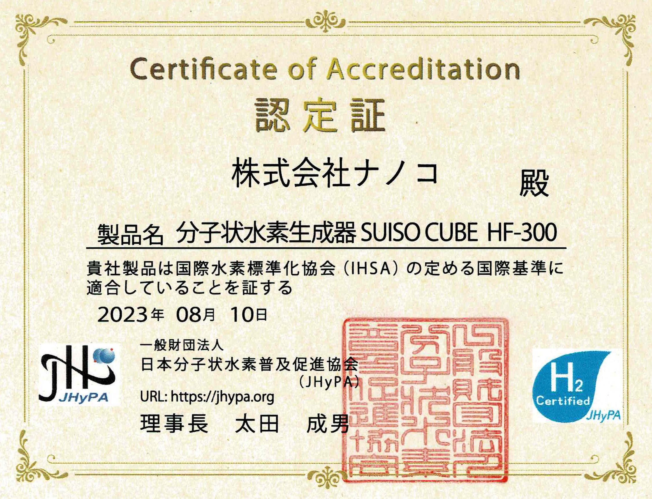 ナノコの高純度水素分子生成器は国際水素標準化協会の定める国際基準をクリアしています。また、これについては一般財団法人日本分子状水素普及促進協会(JHyPA)から弊社製品が国際基準に適合していることについて認定を受け、認定証を受領しました。